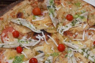 Un clásico de los aperitivos hecho pizza. Boquerones hechos en casa, ajoaceite, patatas fritas y tomates cherry de nuestro huerto...